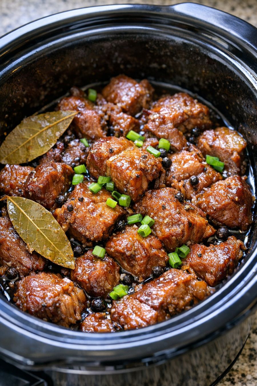 If you like a touch of sweetness with your tang, stir 1 to 2 tablespoons of brown sugar into the mixture before you pour it over the pork—this leans the dish closer to what some families serve for special gatherings. For a little heat, add 1/2 to 1 teaspoon of crushed red pepper flakes or a sliced fresh chili to the slow cooker along with the bay leaves. You can also tuck in a small onion, thinly sliced, for a softer, sweeter background flavor without adding any extra fuss. If you’re watching salt, use a low-sodium soy sauce and add a bit more water, tasting at the end and adjusting as needed. For a lighter version, boneless, skinless chicken thighs can stand in for the pork shoulder; just reduce the cooking time slightly (about 4 to 6 hours on LOW). Leftovers keep well in the refrigerator for several days and the flavors only deepen, making this a fine make-ahead dish—perfect for busy weeks or for sending a jar home with a neighbor, the way we’ve always done with our favorite comfort foods out here in the country.
